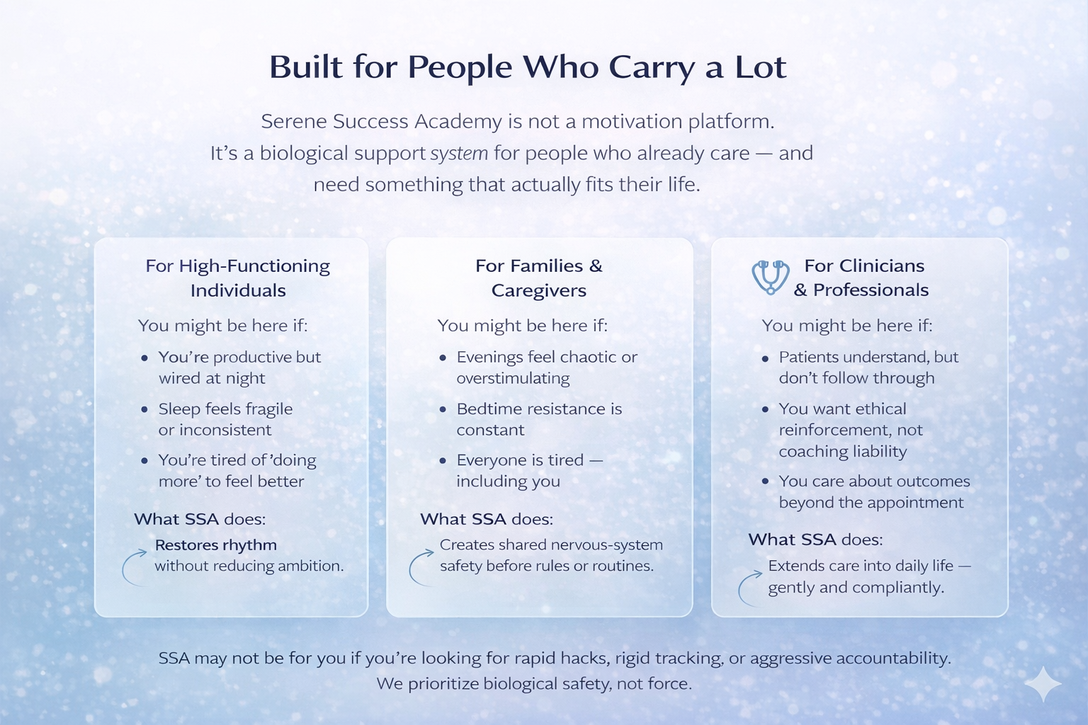 Serene Success Academy (SSA) is a biological habit platform designed to help people live, work, and recover in alignment with their natural rhythms.