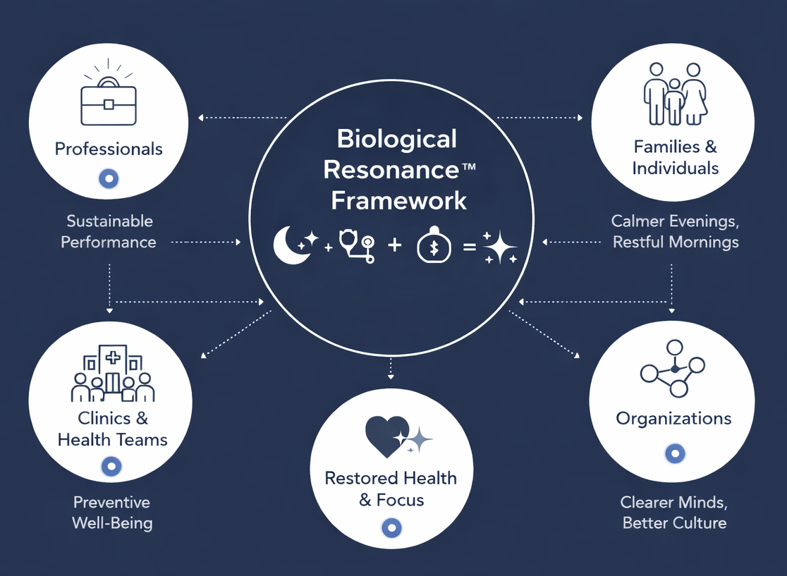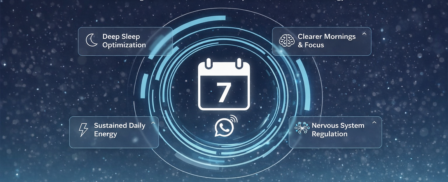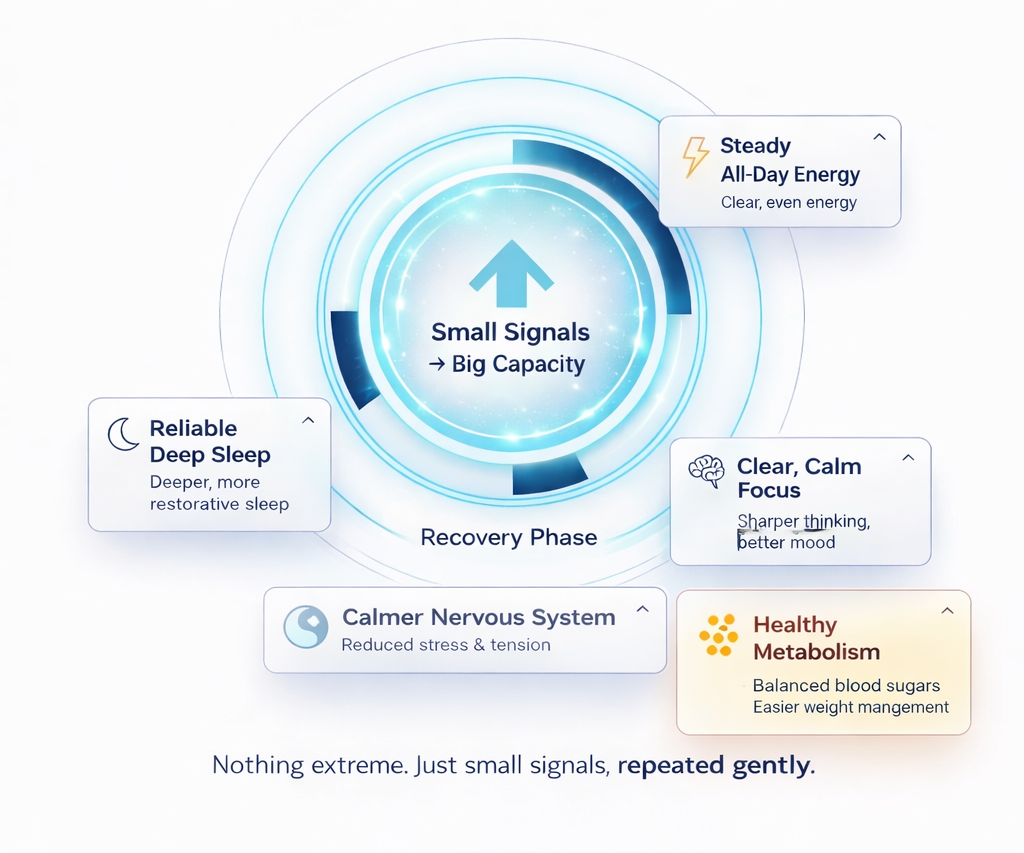 At the heart of it all: restored health, effortless focus, steady energy, deep recovery, and a nervous system that feels safe and regulated. Everything compounds into sustainable peak human potential.